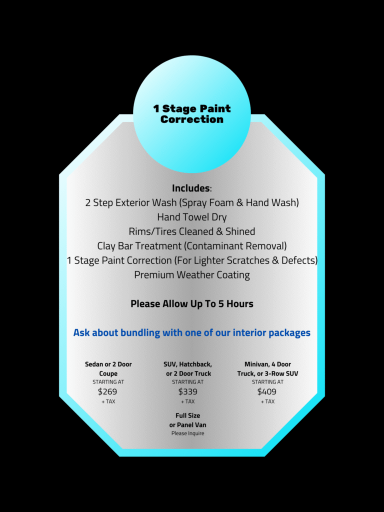 1 Stage Paint Correction – Correct the appearance of minor scratches, scuffs, and swirls, while giving your vehicle a shine you can be proud of.* Our Premium Weather Coating helps to protect your vehicles finish by beading away water and repelling dirt for up to 60 days.