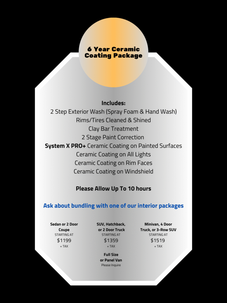 6 Year Ceramic Coating Package – Give your vehicle a brilliant, glossy finish that will repel water, dirt, and help protect against damage. Drive with confidence knowing that you are protected by a registered warranty with System X Ceramic Protection that is good for up to 6 years**