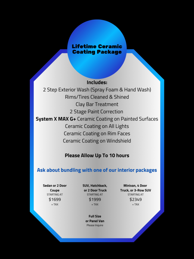 Lifetime Ceramic Coating Package – The ultimate in vehicle paint protection! Repel water, dirt, and help prevent paint damage for 10+ years. Have confidence in knowing your vehicle is backed by a lifetime registered warranty with System X Ceramic Protection**