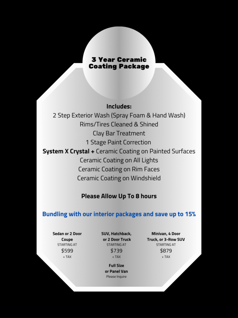 3 Year Ceramic Package – Give your vehicle a brilliant, glossy finish that will repel water, dirt, and help protect against damage for up to 3 years.**